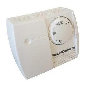 Thermostat d'ambiance mécanique C16 Fantini Cosmi, à réglage par molette de 10°C à 30°C. Contact inverseur NO et NF. Fixation murale. Convient pour des applications de chauffage et climatisation.